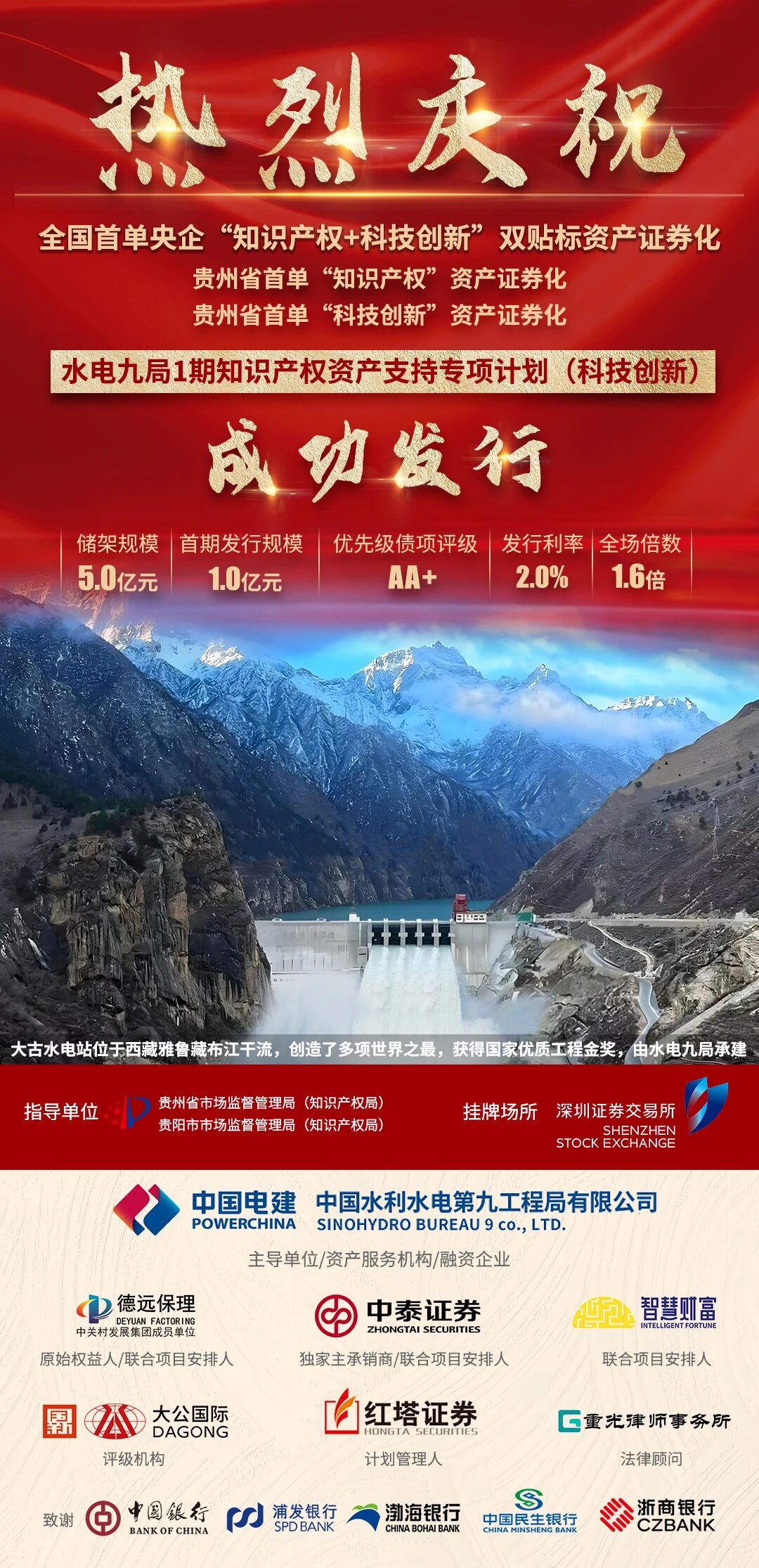 去年8月6日,“水电九局1期知识产权资产支持专项计划(科技创新)”在深圳证券交易所挂牌上市,实现了贵州知识产权证券化“0”到“1”的突破,也创下了全国首单央企“知识产权 科技创新”双贴标ABS和贵州省首单科技创新ABS纪录。